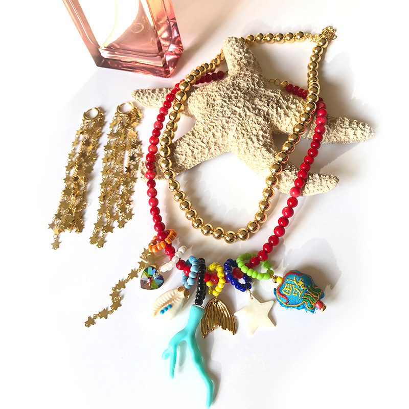 Collar cristales y coral con dijes de Chapa de oro, textil, madre perla, resina, cristal componentes todos en chapa de oro medida 39cm. Mas 3cm extensión.