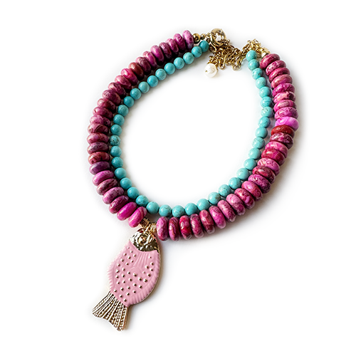 Collar doble Ágathas Rosadas y Turquesa constituida con dije Pez en chapa esmaltado componentes en chapa de Oro 47.5 largo peso 193gr.