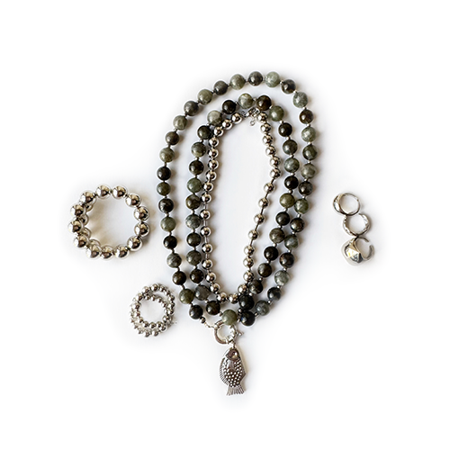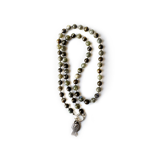 Colar Labradorita dije pez en Acero broche baño plata 94cm. Largo se puede usar vuelta doble peso 210gr.